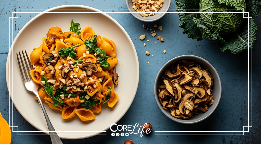 - 2. Meanwhile, heat oil in a large skillet over medium heat. Add garlic and crushed red pepper; cook, stirring once, until fragrant, about 1 minute. Add kale, mushrooms, thyme and salt; cook, stirring occasionally, until the vegetables are soft, about 5 minutes.