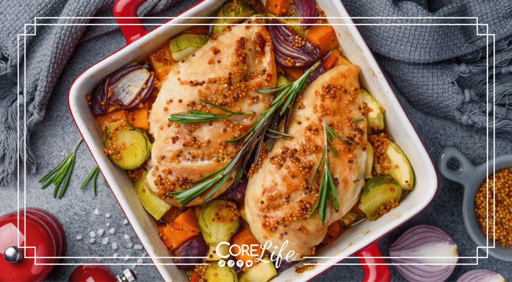 - Roast in the oven for 30 to 40 minutes, or until the chicken reaches an internal temperature of 165°F (74°C) at its thickest part, and the vegetables are tender and caramelized.
